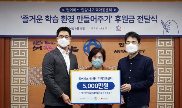 후원금 전달식은 15일 김덕영 펄어비스 인사문화실장, 설미경 안양시지역아동센터연합회장, 이진수 안양시부시장이 함께한 가운데 있었다.