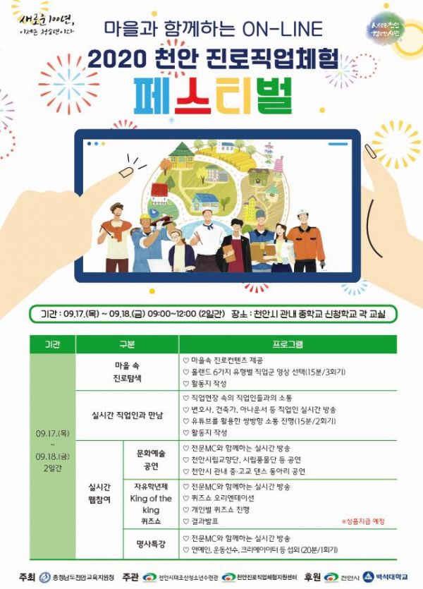 [충청뉴스큐] 천안진로직업체험지원센터는 오는 17일부터 18일까지 ‘마을과 함께하는 온라인 2020 천안진로직업체험 페스티벌’을 개최한다고 밝혔다.