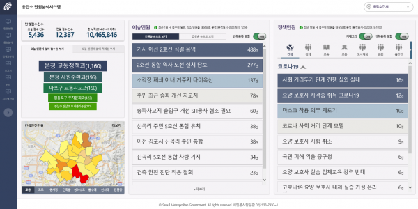 지난 7월 1일 시범 오픈한 AI기반 응답소 민원분석시스템은 코로나19 방역 정책 수행 과정에 민원으로 접수된 다양한 시민의 의견과 제안들을 표출해 주고 있으며 서울시의 코로나19 감염병 극복을 위한 다양한 방역정책에 시시각각 반영되고 있다.