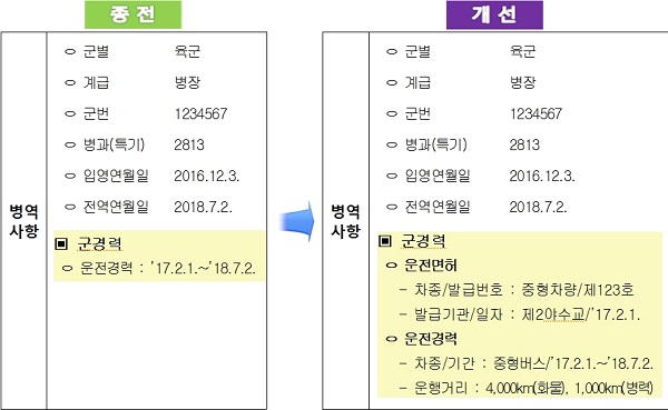 이와 같이 개선하게 된 주된 이유는 그동안 군 운전경력확인서는 국군수송사령부를 통해서만 재발급 받을 수 있어 접근성이 제한되고 발급까지 약 5일이 소요되는 등의 불편을 해소하기 위해서다.