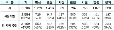 김 의원이 서울시로부터 제출받은 자료에 따르면, 올해 총 이용객은 6,706명으로 서울시민은 53% 이용, 타 지역 주민은 45%의 이용률을 보였고, 이 중 제천, 서천, 함평, 봉화 지역시설은 서울시민보다 타 지역주민의 이용률이 더 높게 나타났다.