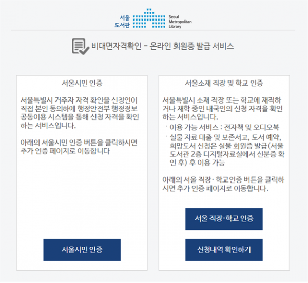 온라인 회원증을 발급 받기 위해서는 서울도서관 홈페이지 회원 가입 후 오른쪽 상단의 ‘비대면 자격확인’에서 신청하면 된다.