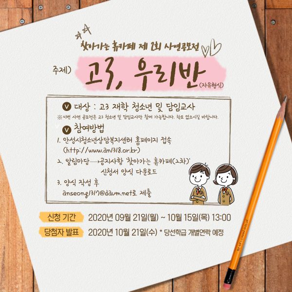 지난 7~8월 ‘우정에 관해’를 주제로 진행한 ‘제1회 찾아가는 휴카페’에 이어 진행되는 ‘제2회 찾아가는 휴카페’는 이달 21일부터 다음달 15일 오후 1시까지 '고3, 우리반'을 주제로 안성 관내 고3 재학청소년 및 담임교사의 사연을 모집한다.