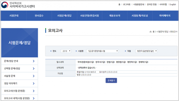 지원하고자 하는 직렬에 해당하는 과목을 연속으로 풀고 답안을 제출하면 자동 채점을 통해 당해 연도의 과목별 점수와 총점, 평균, 합격선도 함께 표시돼 합격 여부를 가늠해 볼 수 있다.