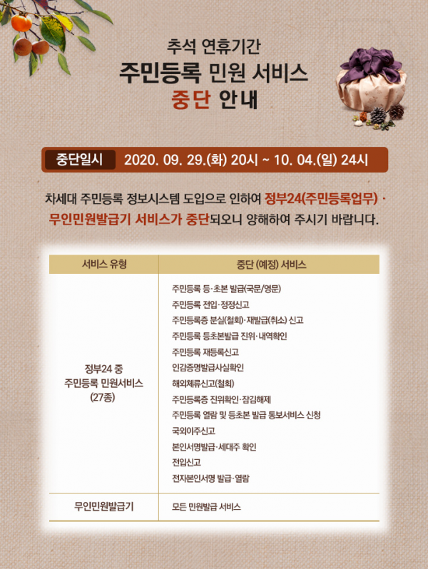 이에 따라, 추석 연휴기간에는 주민등록 등·초본 발급⋅주민등록 전입신고 등 주민등록 관련 서비스가 전면 중단된다.