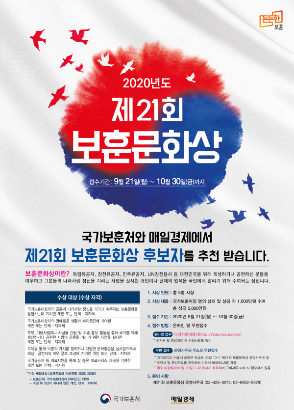 [충청뉴스큐] 국가보훈처는 대한민국을 위해 희생·공헌하신 분들을 예우하고 보훈문화 확산에 기여한 개인과 단체에 시상하는 2020년도 ‘제21회 보훈문화상’ 후보자 접수를 시작한다고 밝혔다.
