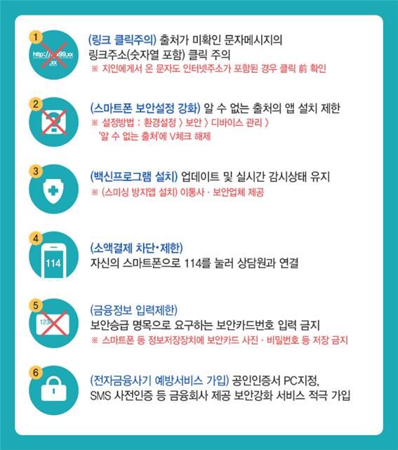 명절 연휴 중 문자결제사기 의심 문자를 수신하였거나 악성앱 감염 등이 의심 되는 경우 국번없이 118상담센터로 문의하면 24시간 무료로 상담 받을 수 있다.