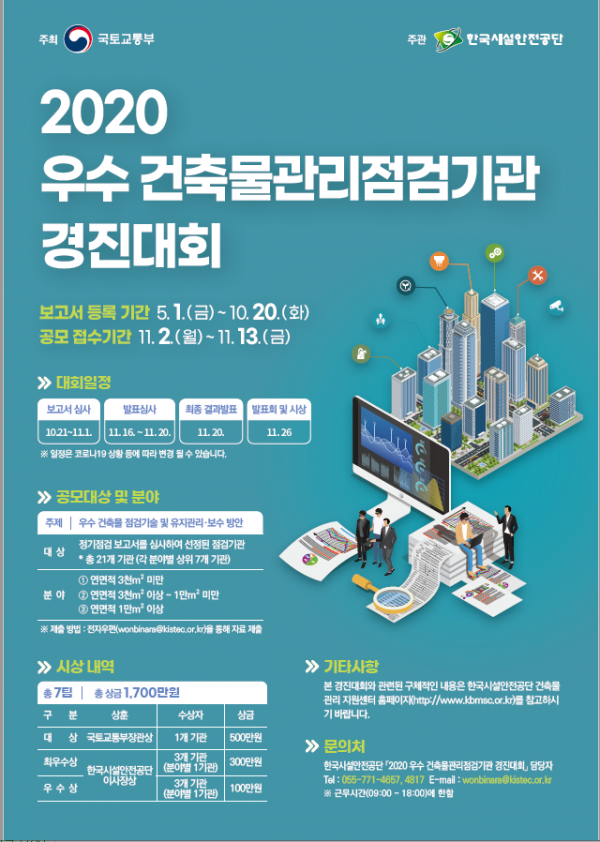이번 경진대회는 올해 5월 1일 시행된‘건축물관리법’에 따라 우수 건축물관리점검기관을 선정하고 건축물의 관리 우수사례 등을 공유함으로써 건축물의 안전 확보 및 사용가치를 향상시키는 것을 목적으로 하고 있다.