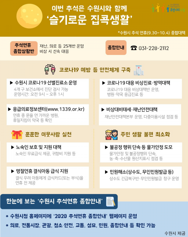 수원시 역시 코로나19 확산 방지를 위한 방역 대책이 포함된 ‘2020 추석 연휴 종합대책’을 마련해 시민 모두가 안전하고 편안한 명절이 되도록 준비 태세를 강화하고 있다.