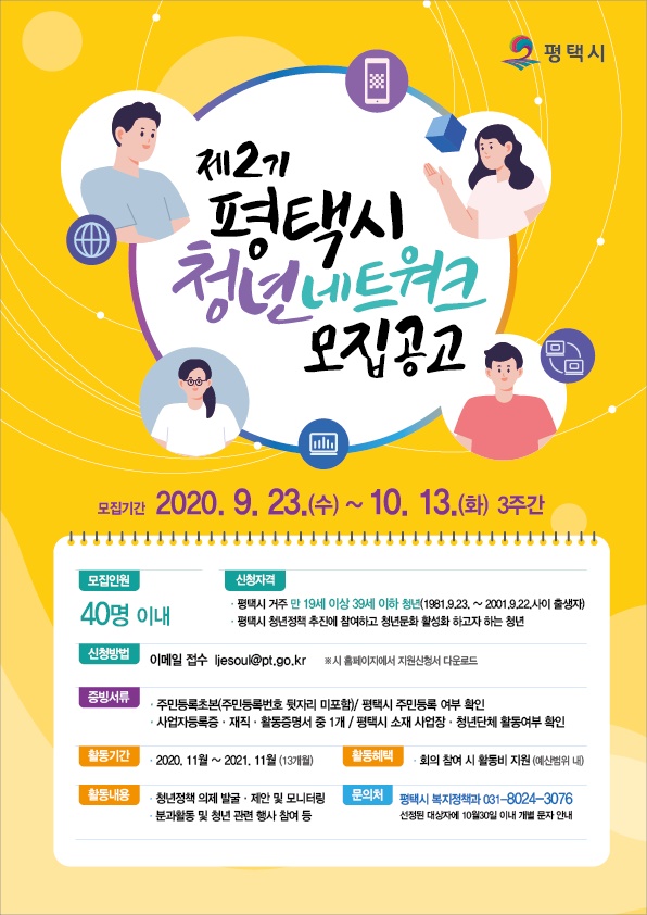 [충청뉴스큐] 평택시는 다양한 청년문제를 주체적으로 고민하고 해결해 나갈 제2기 평택시 청년네트워크를 오는 10월 13일까지 공개모집한다.