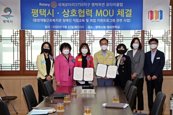 [충청뉴스큐] 평택시는 22일 시청 대외협력실에서 국제로타리3750지구 평택목련 로타리클럽과 장애인직업재활시설 노후시설 교체 및 장애인 취업 프로그램 지원을 위한 업무 협약식을 가졌다.