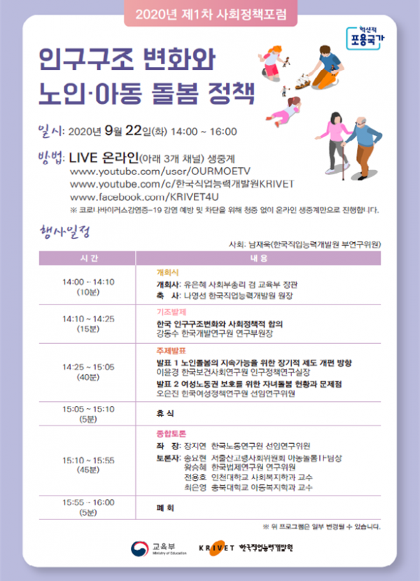 [충청뉴스큐] 교육부와 사회정책협력망은 22일 오후 2시부터 한국직업능력개발원에서 ‘인구구조 변화와 노인·아동 돌봄 정책’을 주제로 제1차 포럼을 개최한다.