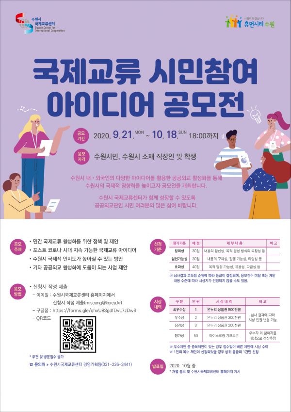 [충청뉴스큐] 수원시국제교류센터가 10월 18일까지 수원시의 국제교류 활성화를 위한 ‘국제교류 시민참여 아이디어’를 공모한다.