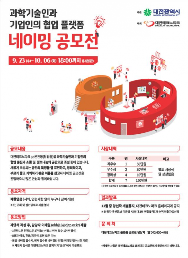 공모기간은 9월 23일부터 10월 6일 오후 6시까지며 제안서 작성 후 대전테크노파크 담당자 전자우편으로 송부하면 된다.