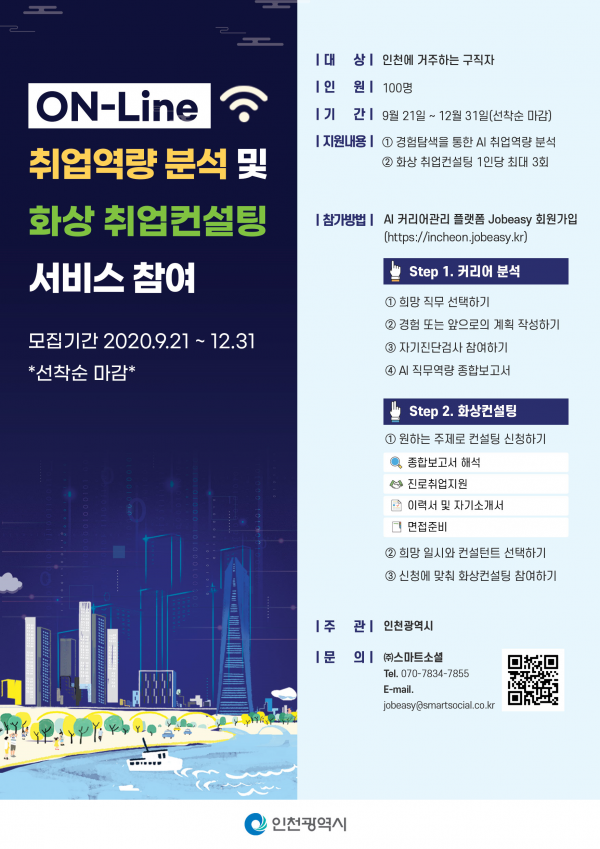 [충청뉴스큐] 인천광역시는 코로나19 장기화로 인해 취업지원센터를 직접 방문하는 등의 대면 취업 활동이 어려워진 구직자들을 지원하기 위해 PC 또는 스마트폰을 활용해 손쉽게 취업 준비를 할 수 있도록 ‘온라인 취업역량 분석 및 화상 취업컨설팅’ 서비스를 연말까지 운영할 계획이라고 전했다.