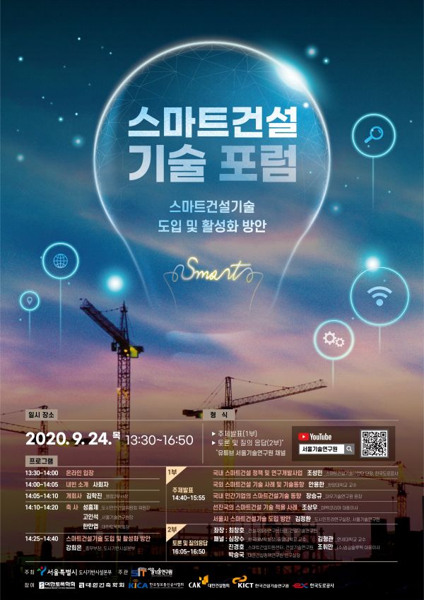 [충청뉴스큐] 서울시는 건설업계, 학계 전문가와 함께 스마트건설기술 스마트건설기술: 설계·시공·유지관리·안전 등 전 건설과정에 BIM·드론·로봇·AR/VR·AI·IoT·빅데이터·모듈러 등 4차산업혁명 기술을 융합해 건설과정의 디지털화, 자동화를 통해 건설 생산성 및 안전성을 극대화하는 기술 도입 및 활성화를 위한 방안을 논의하기 위한 포럼을 9월 24일 오후 2시 롯데호텔서울에서 서울기술연구원과 공동 개최하고 유튜브를 통해 생중계한다고 밝혔다.