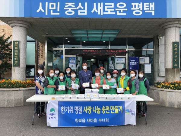 [충청뉴스큐] 평택시 청북읍 새마을부녀회는 23일 청북읍행정복지센터에서 추석을 맞아 관내 독거노인과 장애인 등 소외된 이웃 35세대에 온정을 전하고자 송편을 전달하는 뜻깊은 행사를 마련했다.