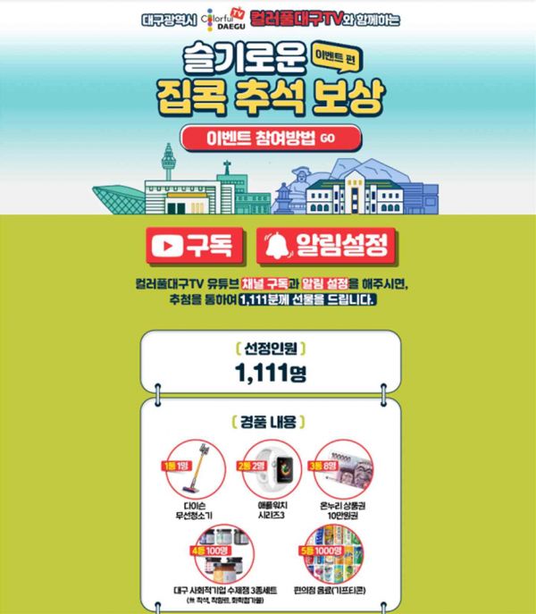 ‘컬러풀대구TV’ 유튜브 채널을 구독하고 대구시 페이스북 채녈에 인증 댓글을 남기면 추석 명절에 걸맞은 실속 있는 경품을 받을 수 있다.