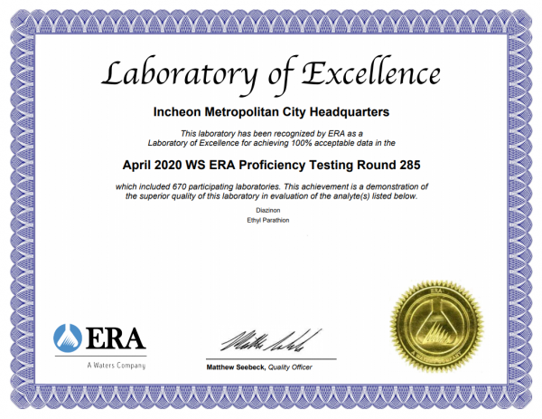 인천시 맑은물연구소는 지난 6월에는 미국에 본사를 둔 국제공인 숙련도시험기관 ERA에서 실시하는 ‘2020년 먹는물 분야 국제숙련도시험’에서도 유기인계 농약성분인 다이아지논 등 2개 항목에서 적합 판정을 받았으며 9월에는 국제공인 숙련도시험기관 Merck에서 주관하는 ‘2020년 먹는물 분야 국제숙련도시험’에서 암모니아성질소 등 15항목에서 국제적 수준의 수질분석 능력을 인정받았다.