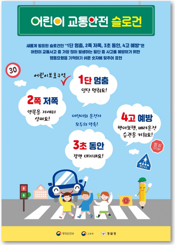 새롭게 발표된 슬로건인 “1단 멈춤, 2쪽 저쪽, 3초 동안, 4고 예방”은 어린이 교통사고 중 가장 많이 발생하는 횡단 중 사고를 예방하기 위한 행동 요령을 기억하기 쉬운 숫자에 맞추어 표현했다.
