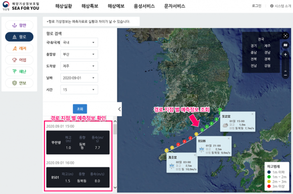 항로기상정보를 통해 미리 바닷길의 파고와 바람 정보를 확인할 수 있으며 여객선 출항이 지연되더라도 지연시간에 맞추어 항로정보를 조회 및 경유 지점별 예상 시간을 반영해 기상정보를 제공한다.