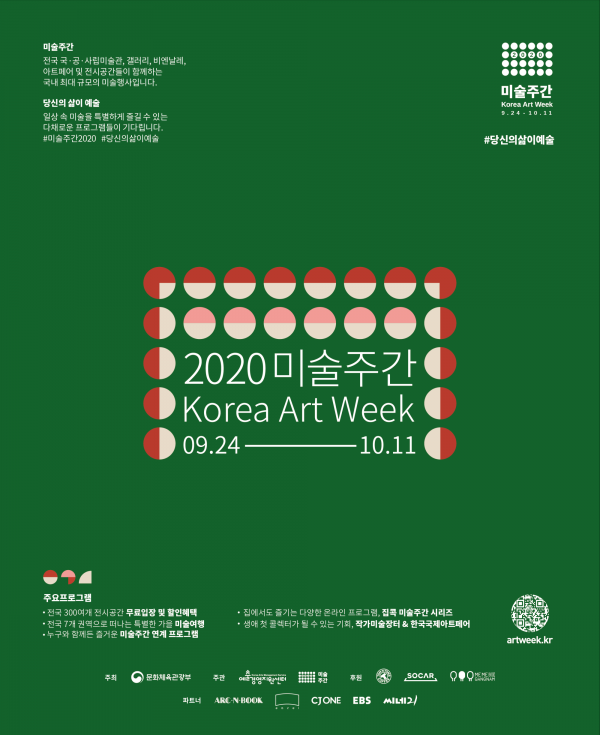 [충청뉴스큐] 문화체육관광부는 예술경영지원센터, 전시기관 300여 곳과 함께 9월 24일부터 오는 10월 11일까지 ‘당신의 삶이 예술’이라는 주제로 ‘2020 미술주간’을 개최한다.