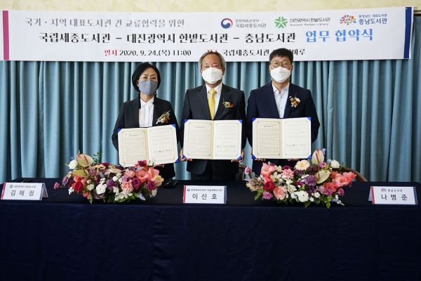 [충청뉴스큐] 한밭도서관, 국립세종도서관, 충남도서관은 24일 오전 11시 국립세종도서관 4층 쉼마루에서 국가·지역 도서관의 상생발전과 우호증진을 도모하고 독서문화적 상호 협력기반을 구축하기 위한 업무협약을 체결했다.