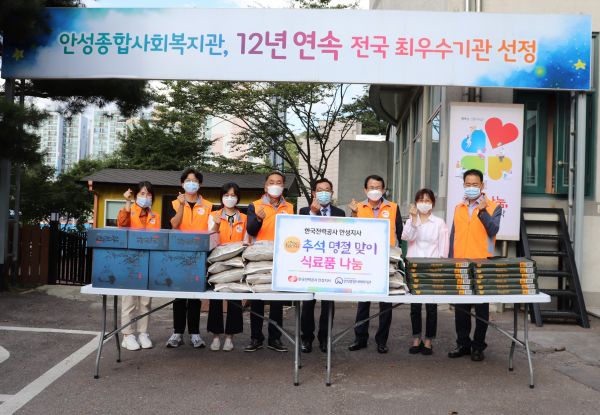 [충청뉴스큐] 한국전력공사 안성지사는 한가위를 맞이해 지난 24일 안성종합사회복지관에 식료품을 지원했다.