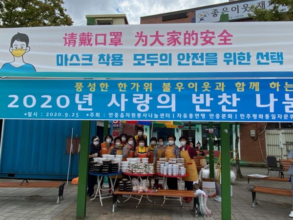 [충청뉴스큐] 평택시 안중읍 자원봉사나눔센터는 지난 25일에 안중읍 관내에 있는 따비공원에서 북한이탈주민, 복지 사각지대에 있는 취약계층 이웃들을 대상으로 추석맞이 반찬나눔 행사를 열었다.