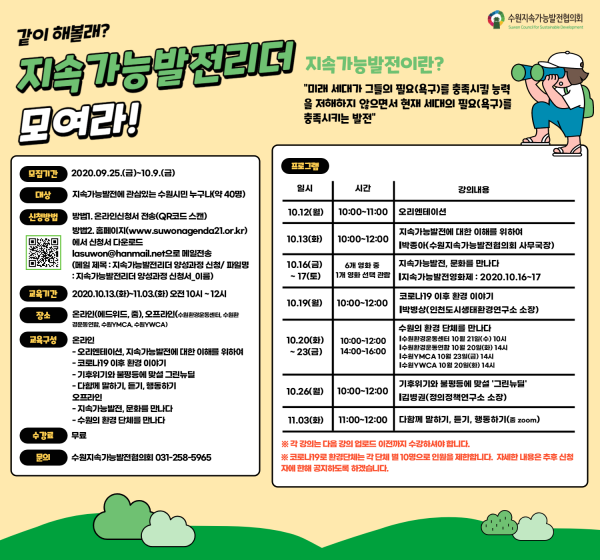 수원시는 ‘2020 지속가능발전리더 양성교육’에 참여할 지속가능발전에 관심 있는 시민 40명을 오는 10월9일까지 모집한다.