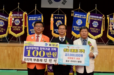 이어, 음성 라이온스클럽 소속 김진석 충북지구 6지역 부총재가 음성장학회에 장학금으로 100만원을 기탁했다.