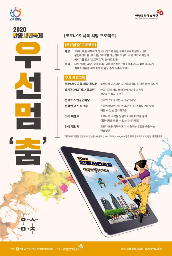 [충청뉴스큐] 2020안양시민축제 우선멈‘춤’이 10월과 11월 두 달 동안 온라인상에서 펼쳐진다.