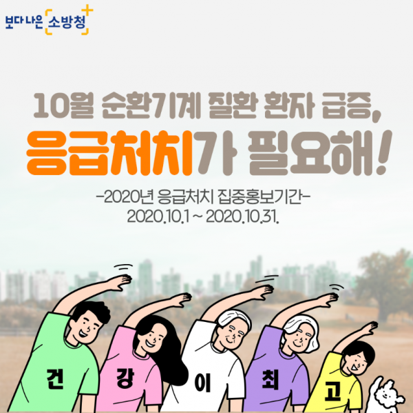 [충청뉴스큐] 소방청은 순환기계 질환자가 급증하기 시작하는 10월 한 달 동안 응급처치 방법에 대해 집중 홍보하고 전국 소방서에서 교육도 실시할 계획이라고 밝혔다.