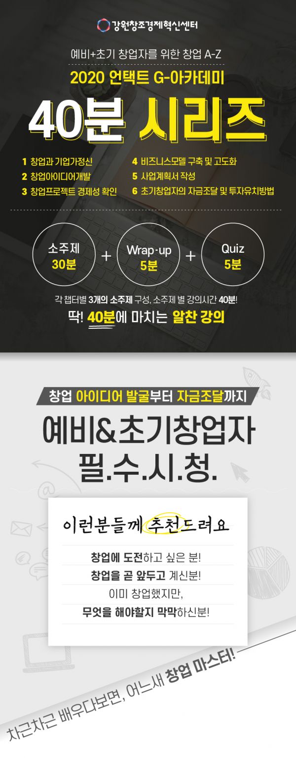 [충청뉴스큐] 강원창조경제혁신센터는 창업교육 프로그램인 ‘2020 언택트 G-아카데미’의 참가자를 모집한다고 밝혔다.