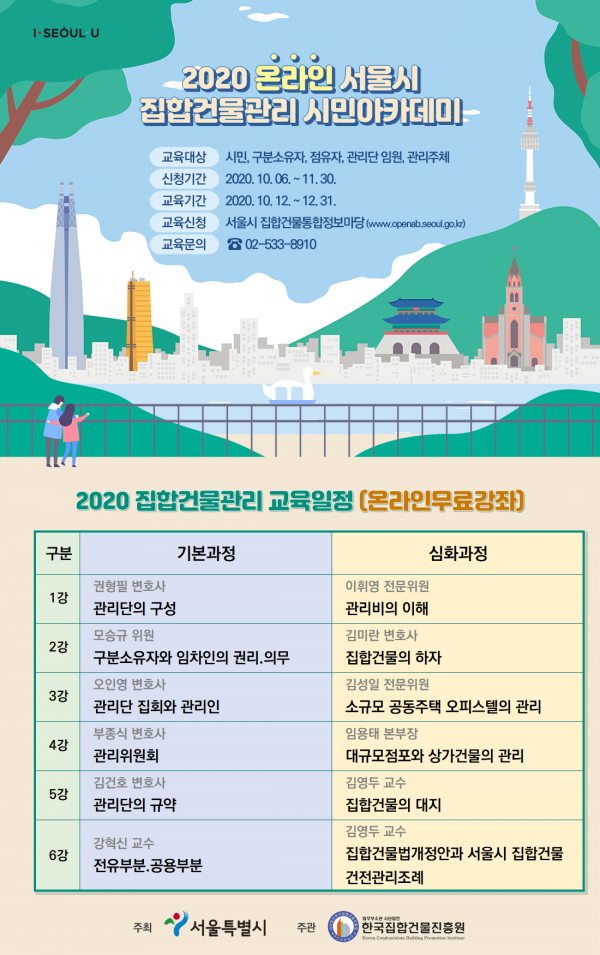 [충청뉴스큐] 서울시는 집합건물의 공정하고 효율적인 집합건물 관리지식 습득 유도 및 구분소유자와 점유자의 권리보호, 입주민의 자치역량 강화를 위해‘2020년 서울시 집합건물 관리 시민아카데미’온라인 강좌를 개강한다.