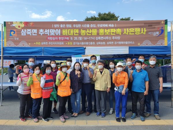 [충청뉴스큐] 안성시 삼죽면 주민자치위원회는 지난 달 28일 삼죽면사무소 주차장에서 추석맞이 비대면 농산물 홍보판촉 사은 행사를 개최했다.
