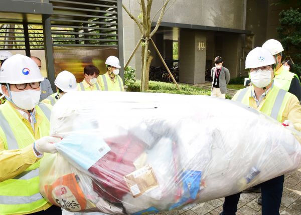 염태영 시장은 4일 오전, 영통구의 한 아파트단지에서 조명래 환경부장관과 함께 재활용품 수거 현장을 점검했다.