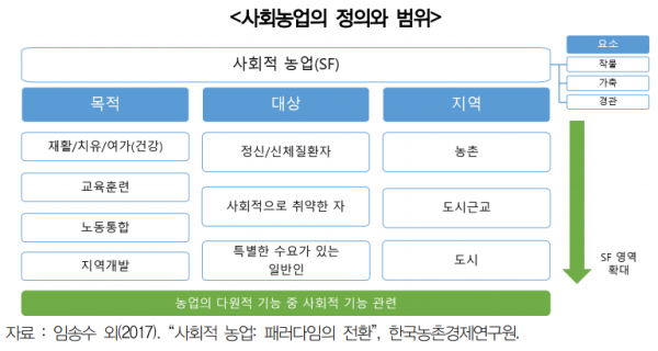 여기에는 농업을 활용해 정신질환자, 고령자, 장애인 등에게 돌봄 및 교육 서비스를 제공하고 일자리와 새로운 소득원을 창출하는 일련의 농업활동을 포함한다.