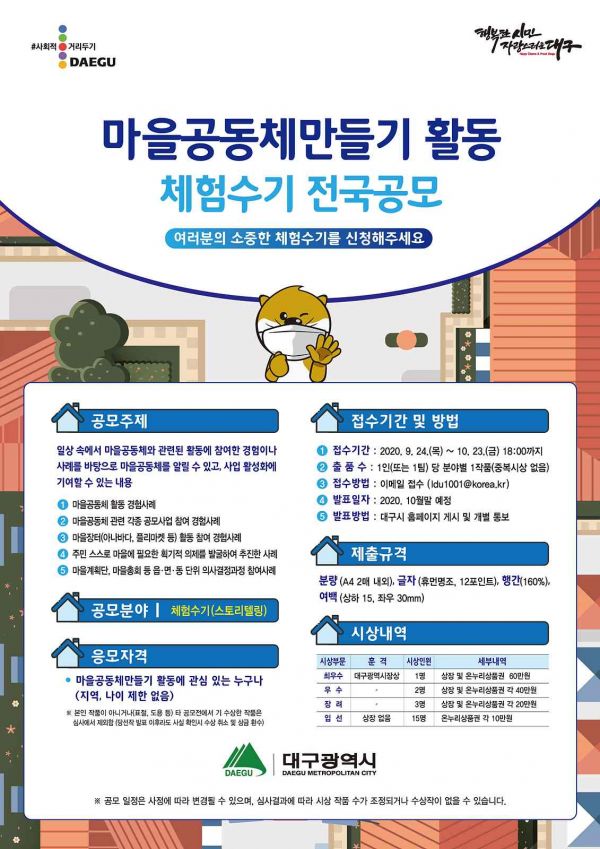 심재균 대구시 자치행정국장은 “코로나19로 활동에 많은 어려움을 겪고 있는 마을공동체 활동가들의 소중한 체험수기를 전국에서 처음으로 공개 모집한다”며 “이번 공모전이 마을공동체 사업이 더욱 활성화되는 계기가 되기를 바란다”고 말했다.