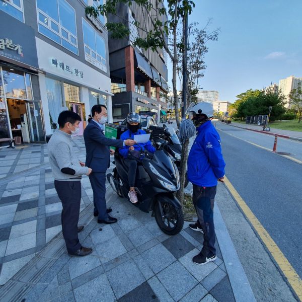 여상수 동장과 공무원들은 배달대행업체 및 배달전문음식점을 대상으로 이륜차 사고 예방을 위한 홍보물을 배포하며 배달종사자와 시민의 안전을 위해 교통법규를 철저히 준수해 줄 것을 요청했다.