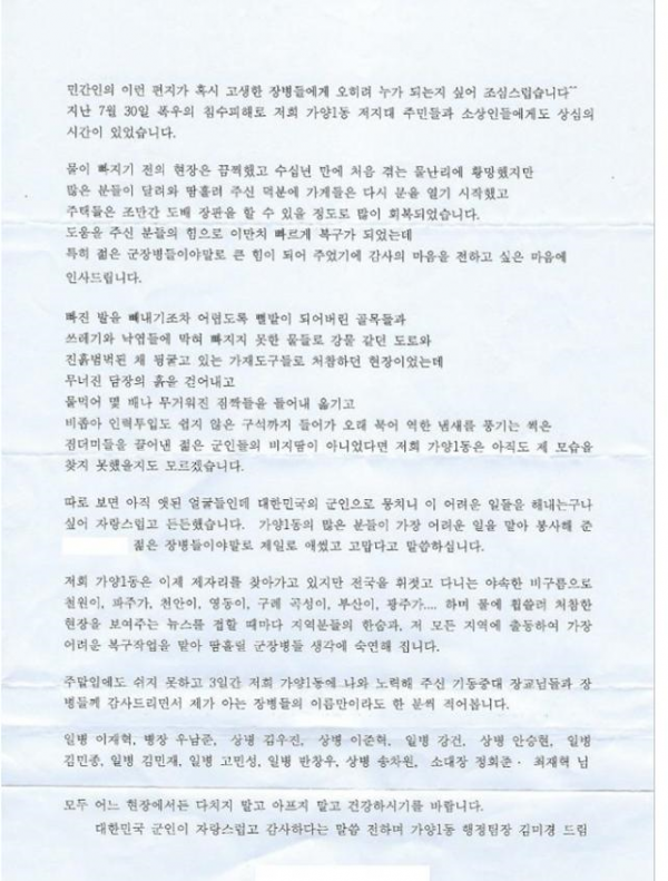 이어 수해복구 활동 중 기억한 장병들의 이름을 일일이 적으며 고마운 마음과 함께 건강한 군 생활을 빌었다.