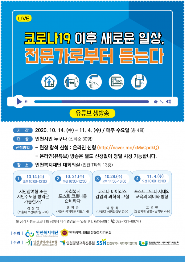 이어 10월21일에는 홍영준 서울시복지재단 대표이사가 ‘사회복지 포스트 코로나를 준비하다’를, 10월28일은 박종화 울산과학기술대 생명과학부 교수가 ‘코로나 바이러스 감염의 과학적 고찰’을 주제로 강연한다.