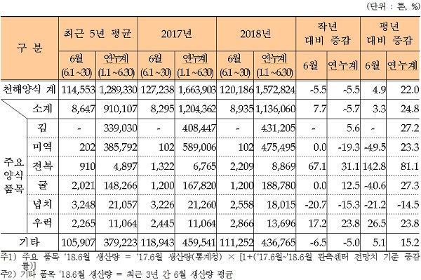 [충청뉴스큐] 해양수산부는 2018년도 상반기 양식 수산물 생산량이 약 157만 3천 톤으로 집계됐다고 밝혔다. 이는 최근 5년 평균에 비해 약 22% 증가한 수준이나, 역대 최대 수준이었던 2017년 상반기에 비하면 소폭 감소했다.