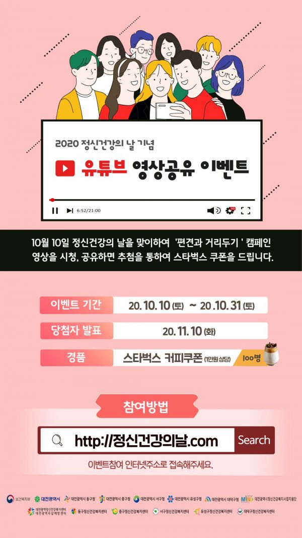 영상물은 대전광역정신강복지센터 유튜브 ‘마음채널’을 통해 시청할 수 있으며 온라인 소통 강화를 위해 유튜브 영상공유 이벤트도 진행된다.