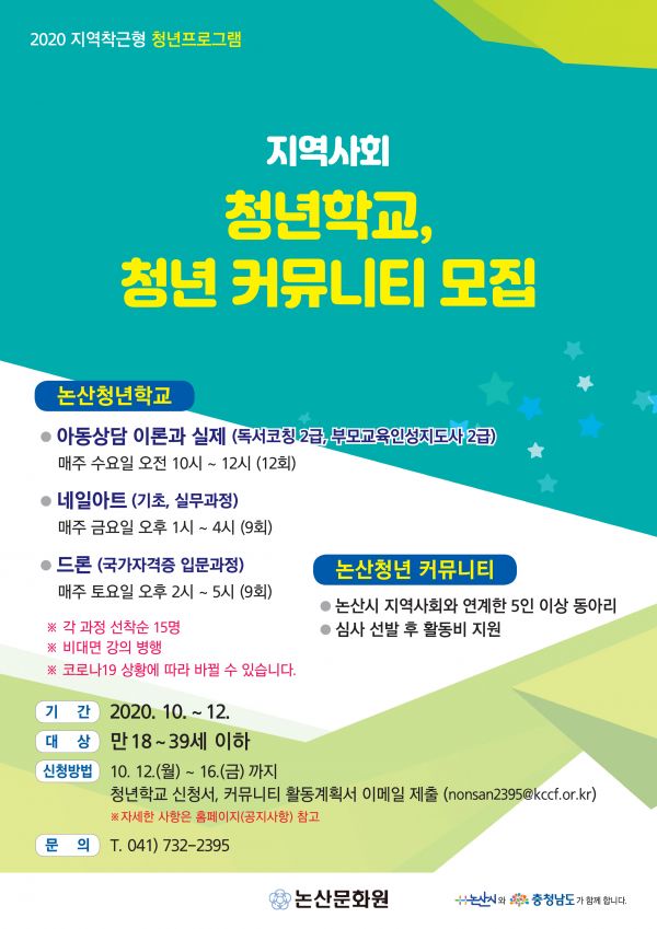 논산청년학교의 경우 관내 청년이 지역에서 자립할 수 있도록 돕는 다양한 학습강좌를 제공하며 드론, 네일아트, 아동상담 등 3개 과정을 개설해 각 15명의 수강생을 모집할 계획이라고 전했다.