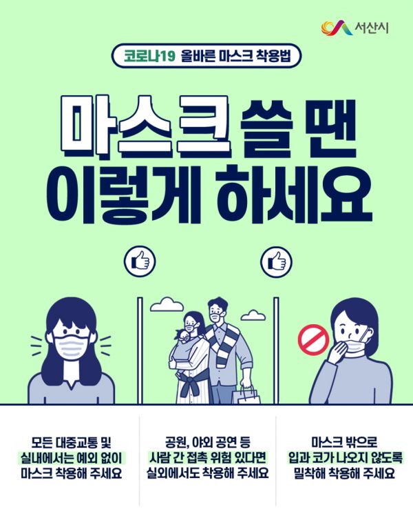 송기력 서산시보건소장은 “마스크를 정확히 착용하지 않으면 마스크 착용으로 인정되지 않기 때문에 올바른 착용에 특별히 신경을 써주시기 바란다”며 “시민들의 적극적인 협조와 실천을 부탁드린다”고 말했다.