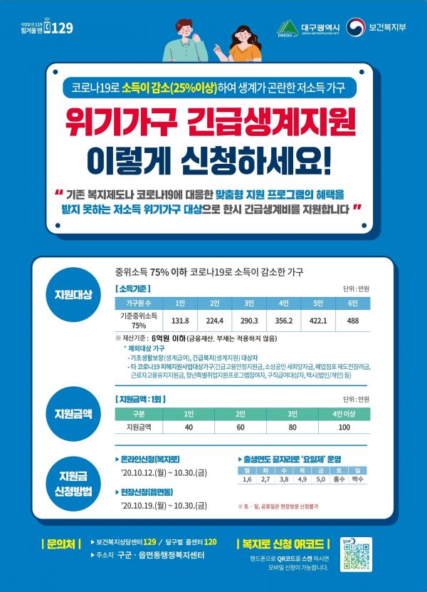 조동두 대구시 복지국장은 “코로나19 피해지원을 받지 못하는 위기가구 대상자 분들이 긴급 생계지원금 신청 및 지원에 불편함이 없도록 최선을 다 하겠다”고 말했다.