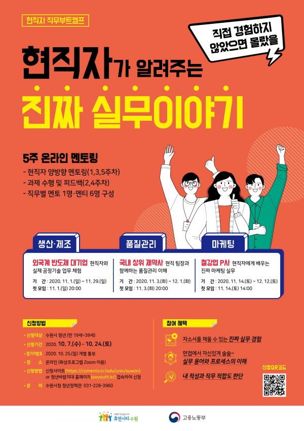 [충청뉴스큐] 수원시가 기업 현직자와의 취업 멘토링을 지원하는 ‘현직자가 알려주는 진짜 실무이야기’ 참여 청년을 오는 10월 24일까지 모집한다.