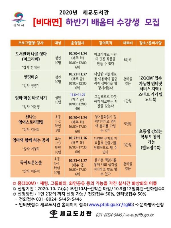 [충청뉴스큐] 평택시립세교도서관은 하반기 성인 및 어린이 배움터를 줌을 활용한 비대면 프로그램으로 운영한다.