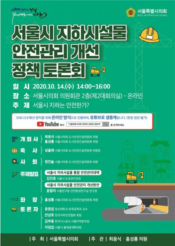 [충청뉴스큐] 서울시특별시의회 도시안전건설위원회 최웅식 의원과 홍성룡 의원이 공동주관하는 ‘서울시 지하시설물 안전관리 개선 정책토론회’가 오는 14일 오후 2시 서울시의회 제2대회의실에서 무청중 온라인 방식으로 개최되어 서울시 지하시설물 안전관리 개선방안에 대한 입체적인 논의가 펼쳐질 예정이다.